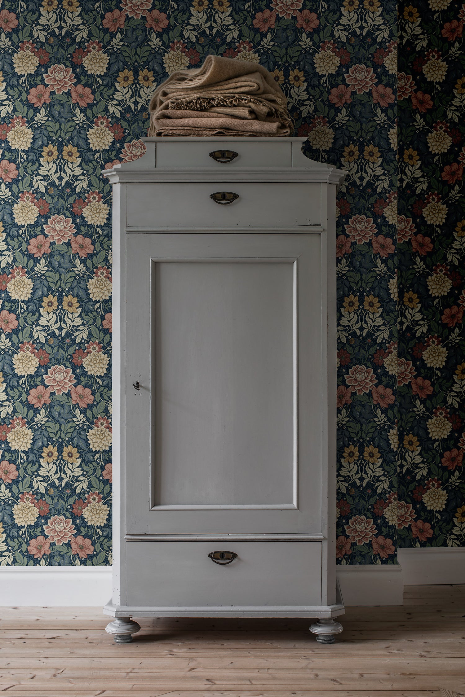 The Dahlia Garden's flamboyant floral pattern was hand-painted by designer Jenny Hahne Gadd just a few years ago. Here, however, there are strong influences from the Arts & Crafts movement, and this particular color scheme with a blue background feels so typical of Arts & Crafts - playful, but still gentle and collected.