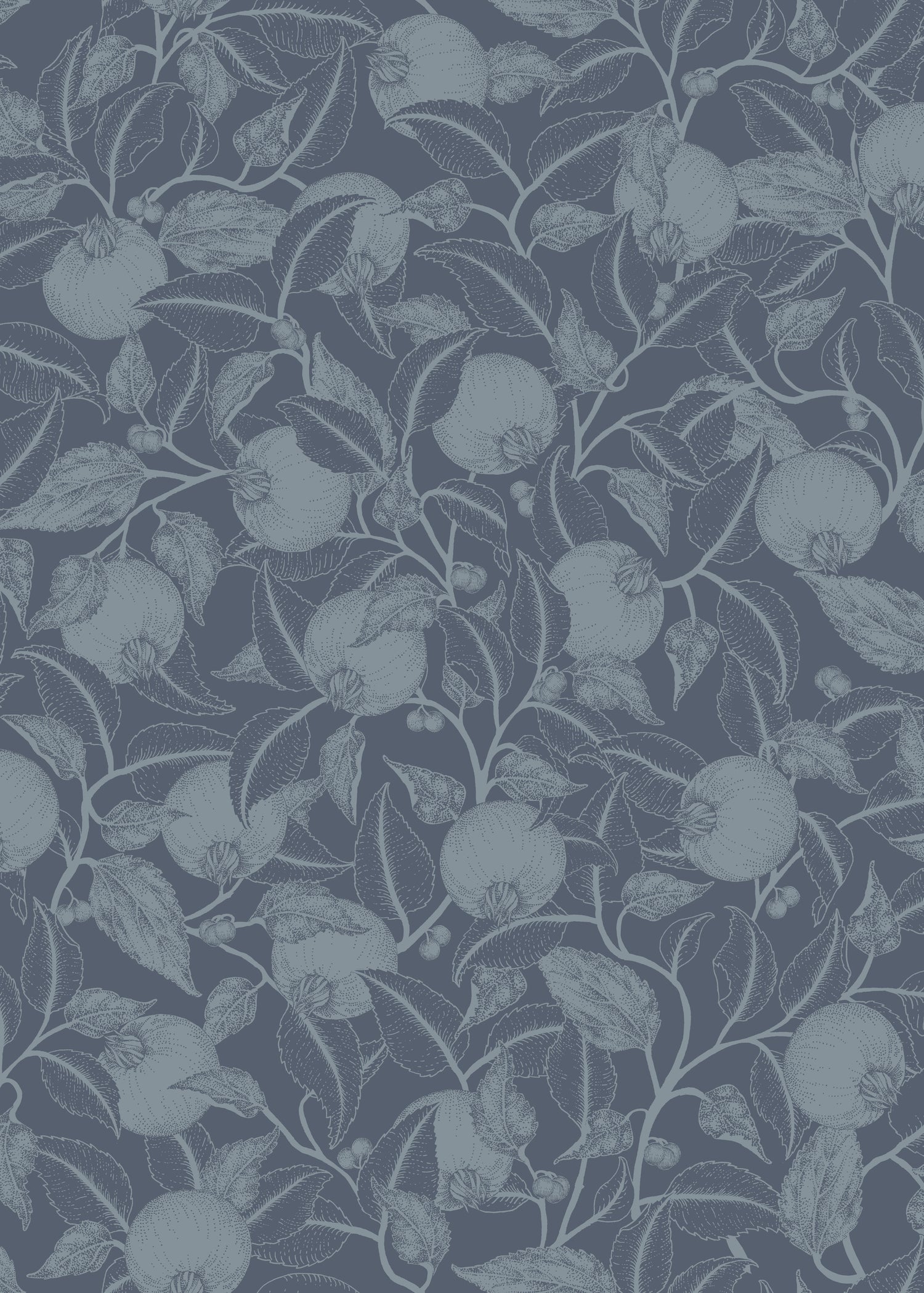 The pomegranates wallpaper is available in multiple colour schemes. Here you see the wallpaper with lighter blue pomegranates against a darker blue background.