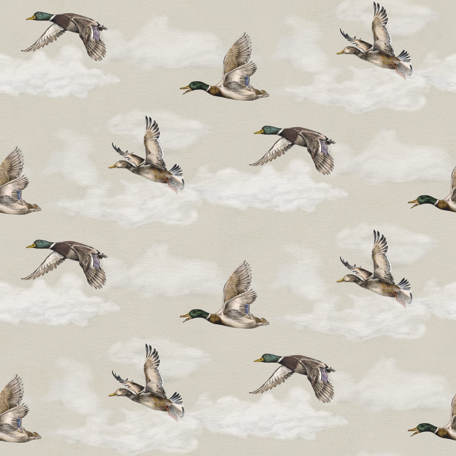 This beautifully illustrated wallpaper features a stunning pattern of majestic mallard ducks in full flight, soaring gracefully against a backdrop of soft, billowy clouds.