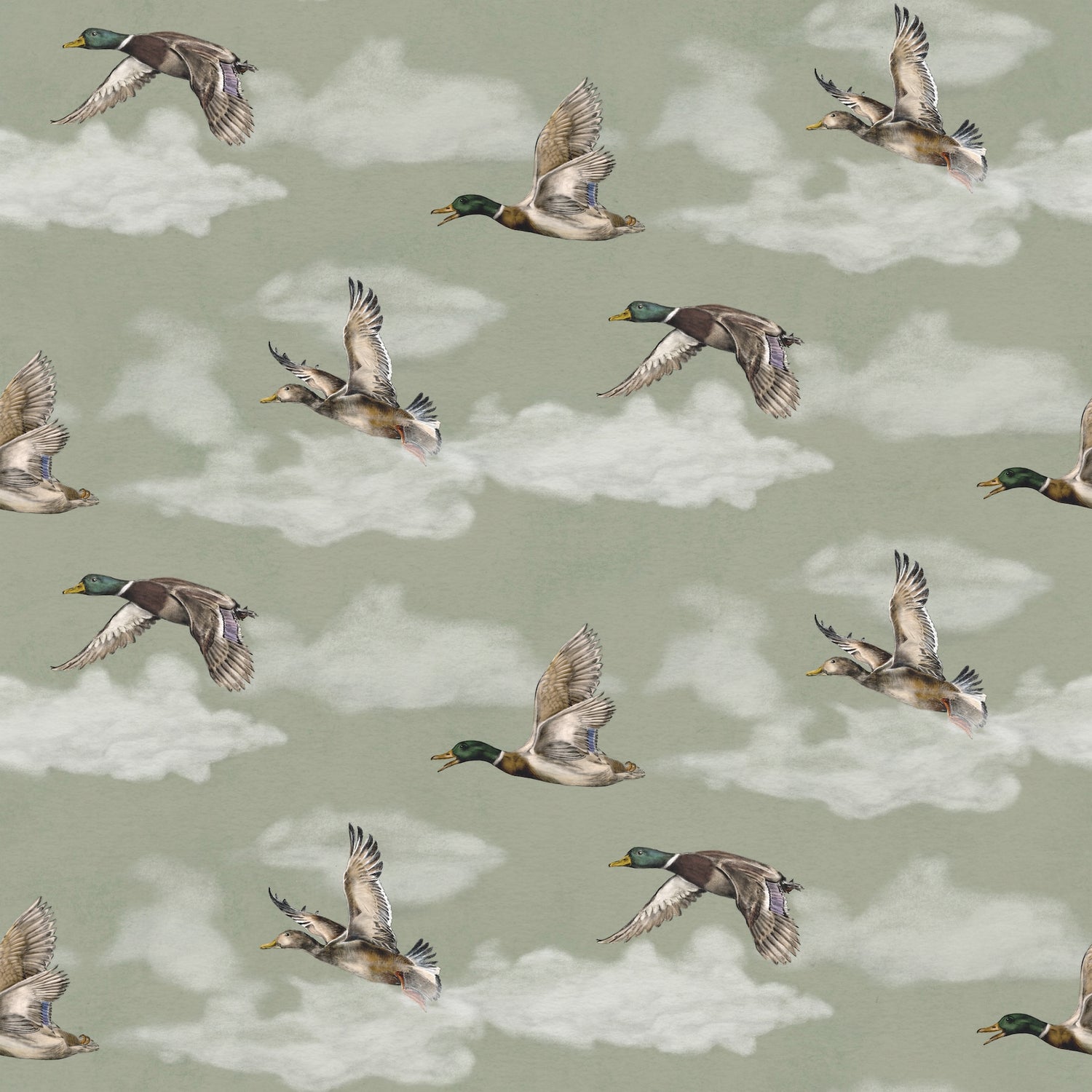 This beautifully illustrated wallpaper features a stunning pattern of majestic mallard ducks in full flight, soaring gracefully against a backdrop of soft, billowy clouds.