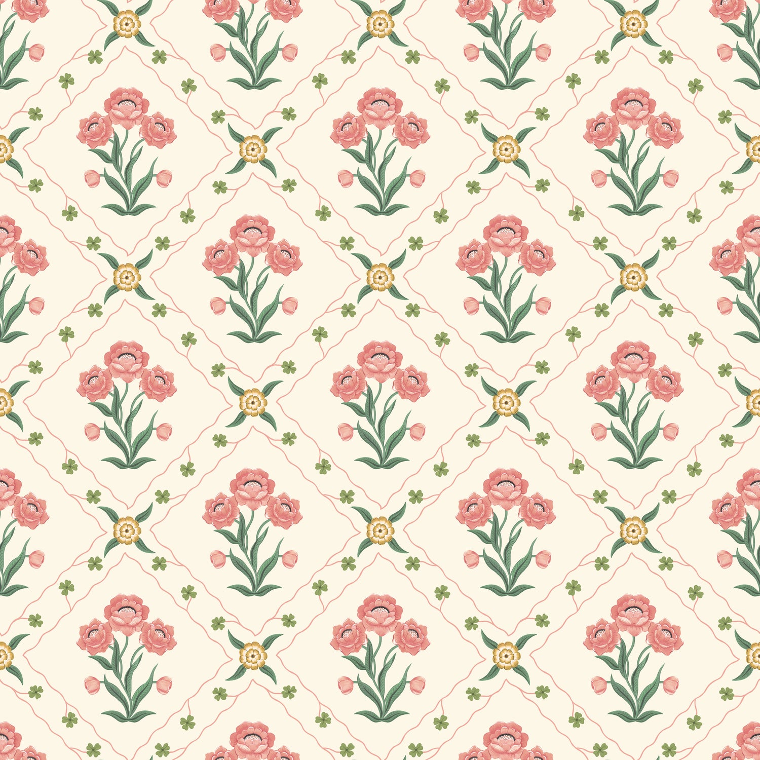 This floral trellis wallpaper features a simple yet elegant pattern of bold flowers in pink and beige. Perfect for adding a timeless touch to your space.
