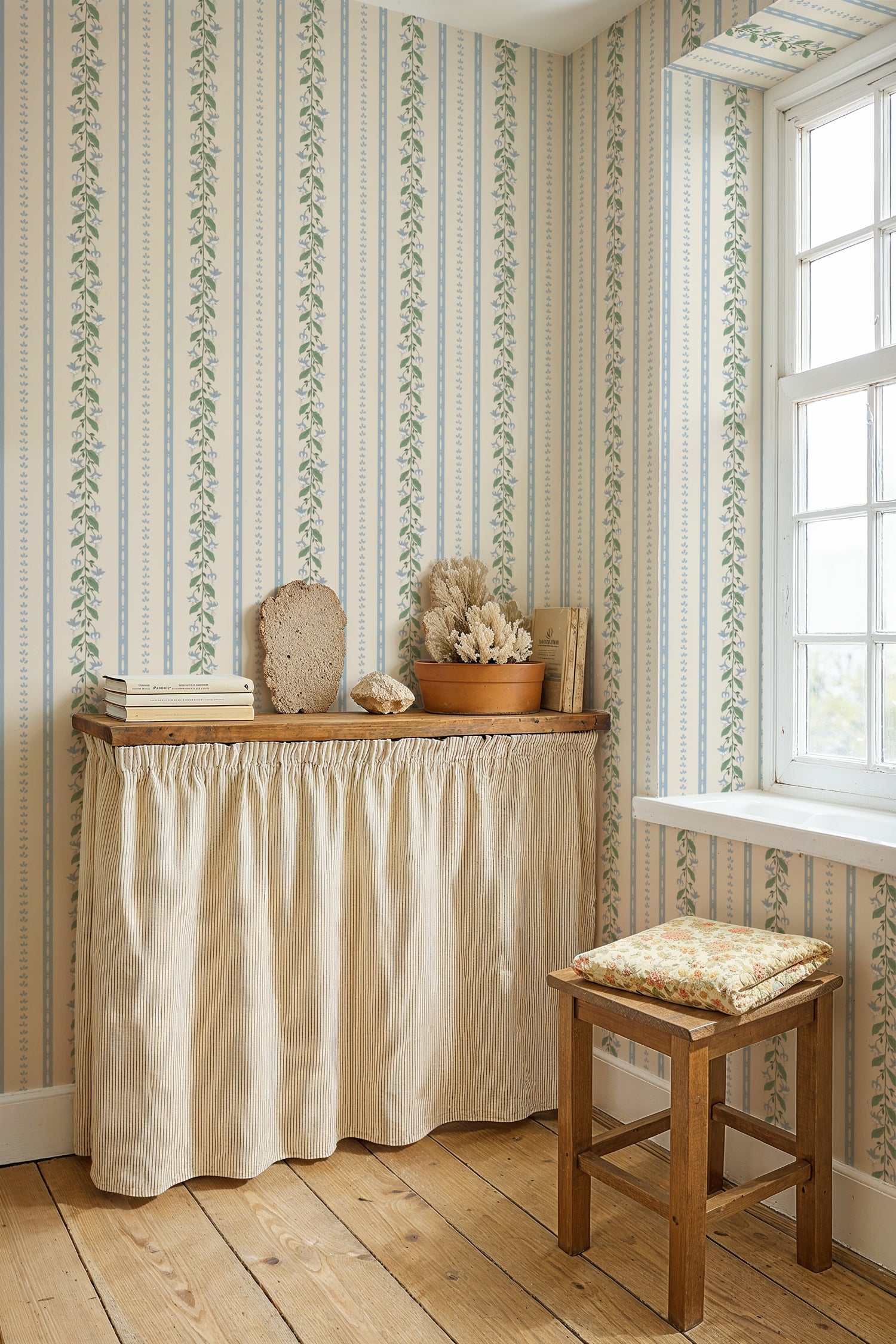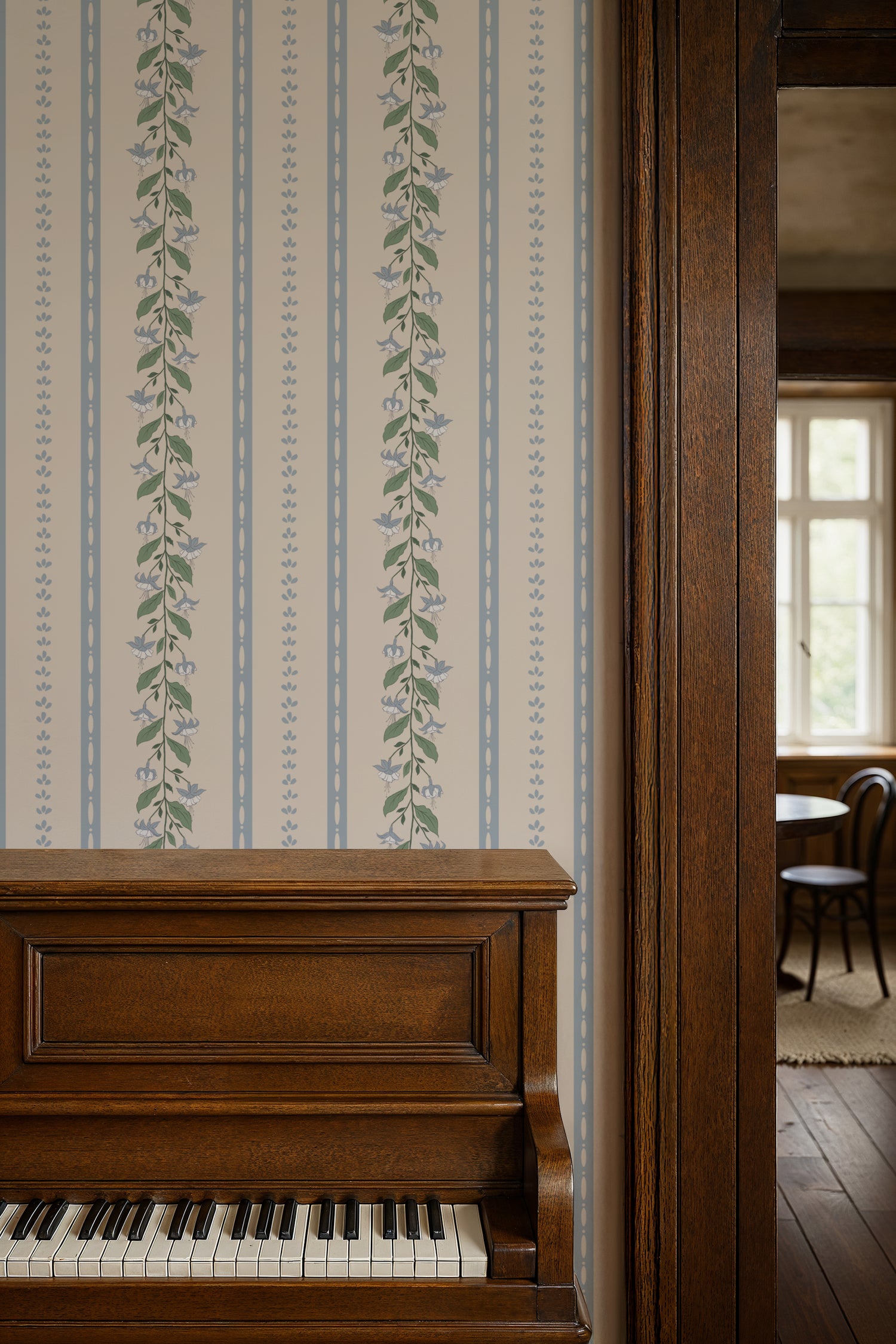 A stripe with character and poise, this design weaves together the delicacy of florals with the structure of decorative lines, creating a refined balance of pattern and atmosphere. With its subtle nod to vintage style, it sits beautifully in a panelled hallway, alongside rich dark oak, or as a statement feature in more contemporary spaces. The result is a versatile stripe that lends a quiet elegance and a gentle, seasonal charm to any interior.