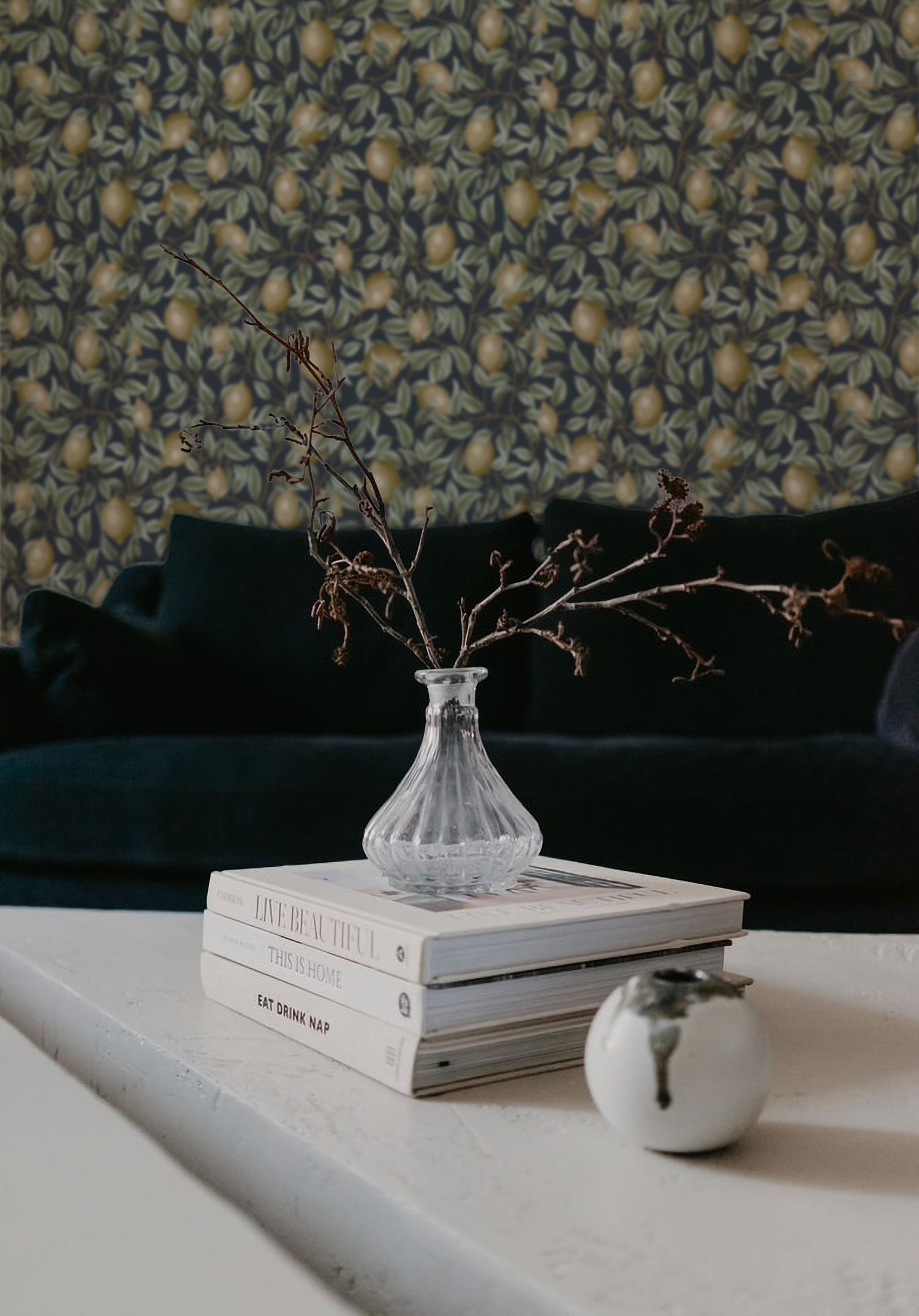 Le papier peint Lemon Trees est disponible en 5 couleurs : Olive, Seagrass, Sage, Tea et Midnight Blue