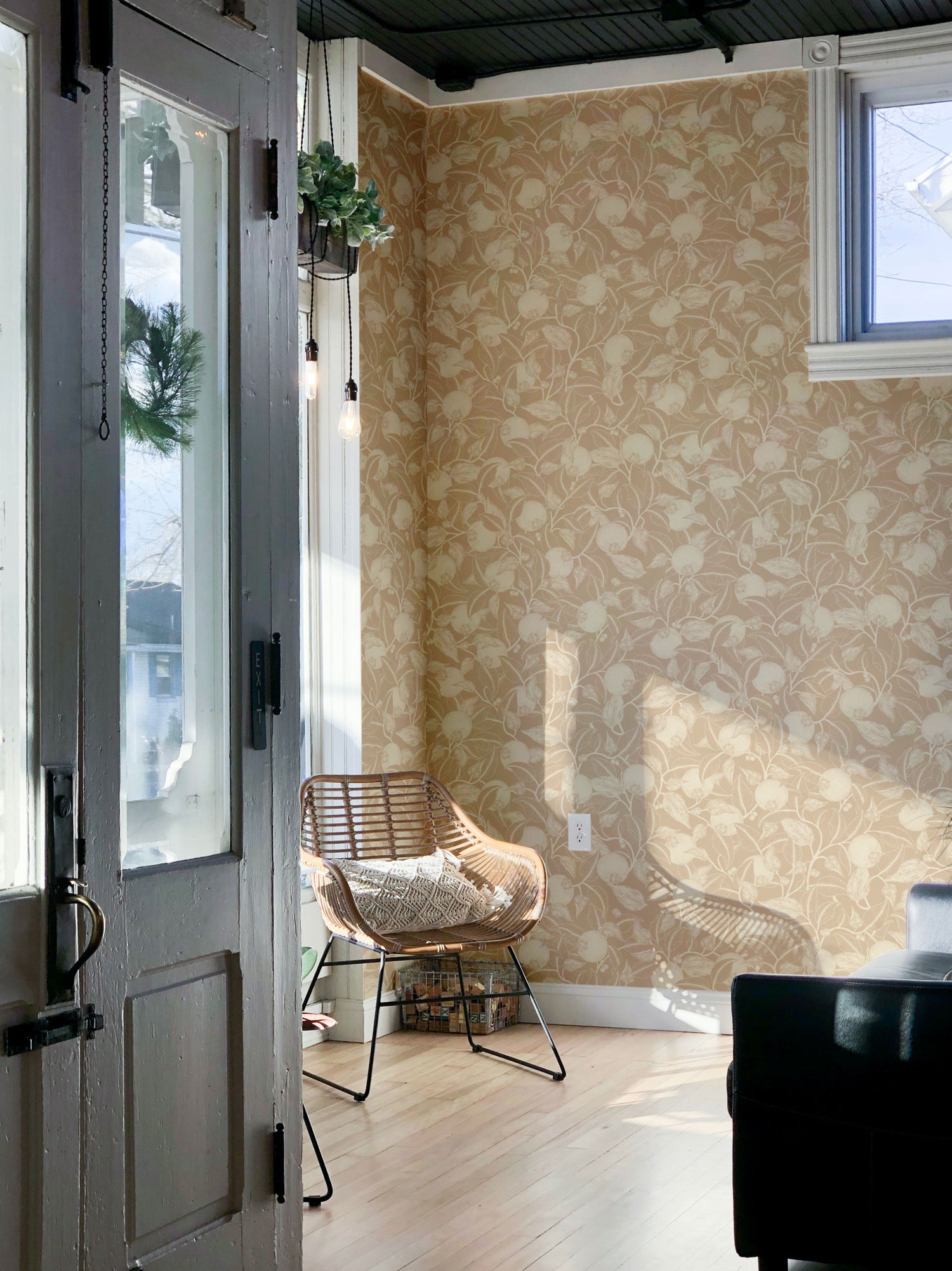 Ce papier peint à main levée de citronnier en fleurs par Kicki Fjell apporte de la vie à n'importe quelle pièce.
