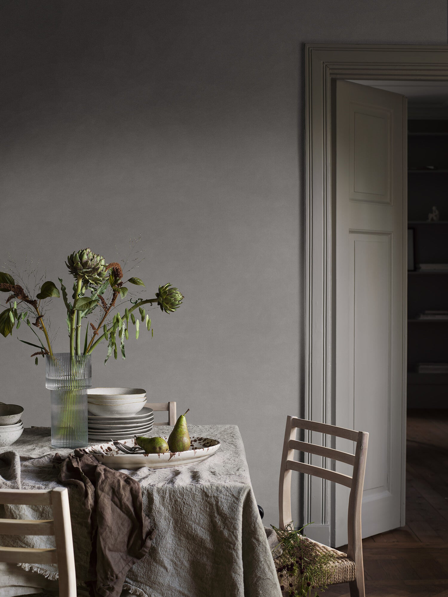 Le papier peint Shades of Chalk est disponible en 31 couleurs différentes. Ici, vous voyez le papier peint dans une teinte gris brume rappelant la stéatite claire. La même surface est également disponible en plusieurs autres nuances de gris, n'hésitez pas à commander des échantillons de papier peint pour la maison lorsque vous choisissez votre préféré.