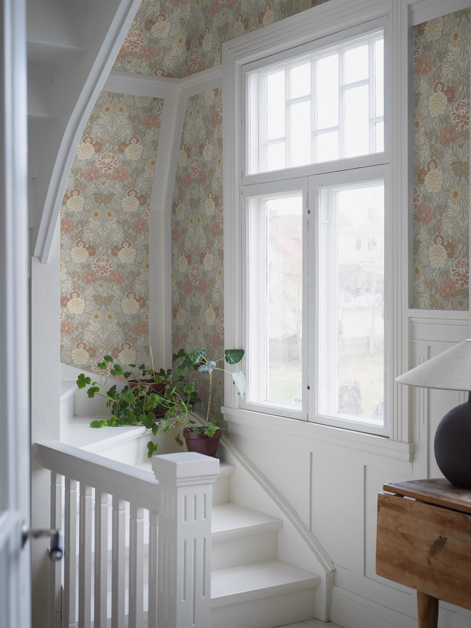 Le motif dense crée une atmosphère calme mais vivante et chaleureuse dans la pièce. Dahlia Garden est disponible dans un certain nombre de schémas de couleurs.