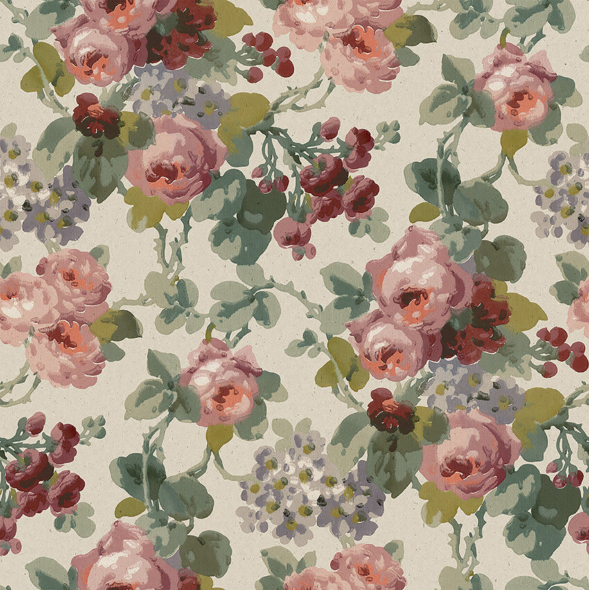 Coloré dans une palette de rouge, rose et vert sur un fond neutre chaud, notre papier peint Madame évoque le parfum et la chaleur d’un jardin d’été. Le motif romantique et saisissant, à l’esprit français, présente des roses en pleine floraison dans des rouges profonds et des roses séduisants sur un feuillage vert frais grimpant sur les murs. Utilisant l’impression collagraphique traditionnelle pour une surface structurée et vibrante, il date des années 1920 environ.