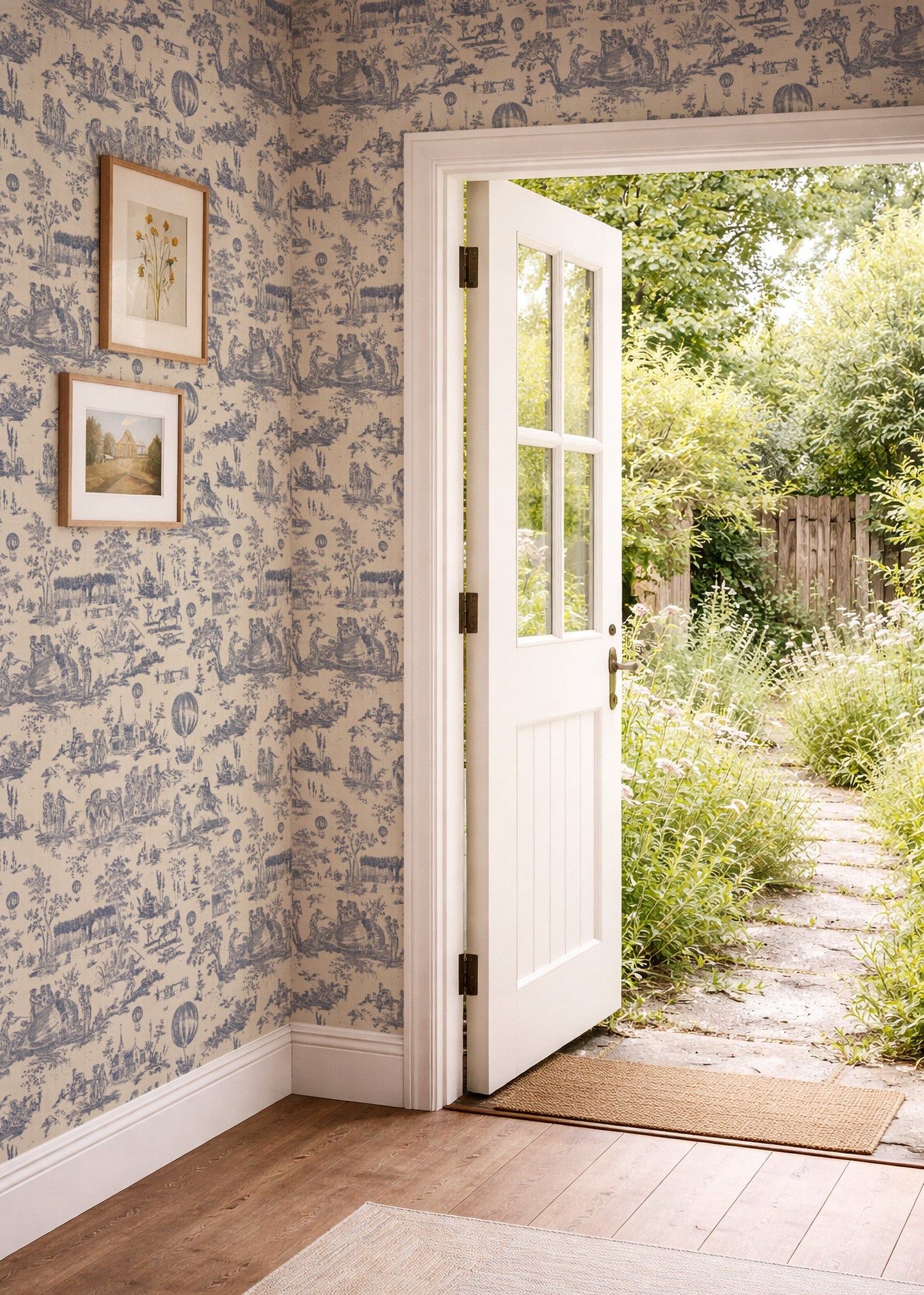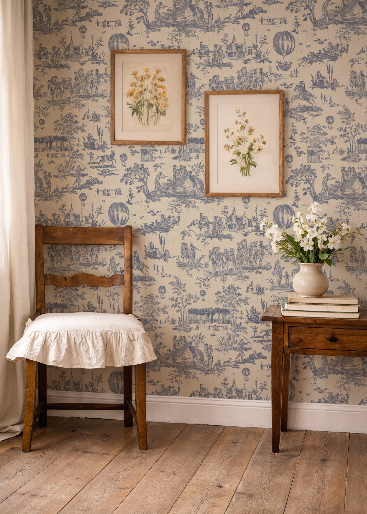 Created by the historic Toile de Jouy pattern “Le Ballon de Gonesse,” this wallpaper captures the wonder of one of humanity’s earliest flights. The design beautifully illustrates the 1783 journey of the first gas balloon as it drifted from the Louvre to the village of Gonesse—an event that marked the dawn of aviation. Delicate, story-rich scenes unfold across the surface, blending classic French elegance with a sense of curiosity and adventure, making it a timeless statement for any interior.