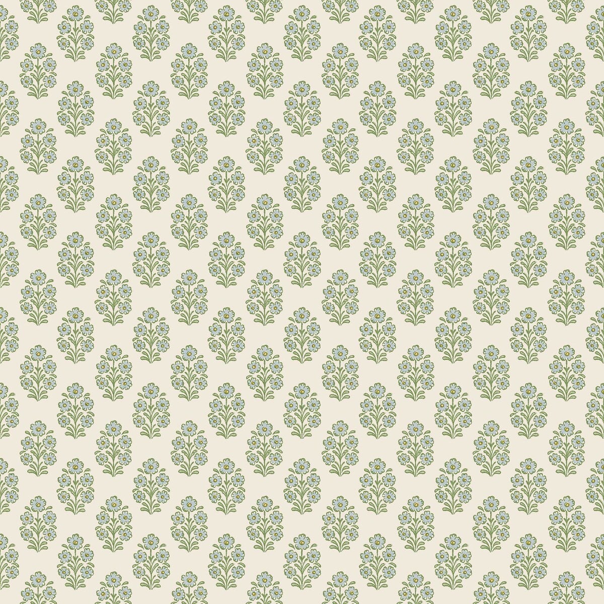 Le papier peint Sibylla présente de petits bouquets dessinés à la main dans des nuances douces de bleu et de vert sur un fond blanc crème, créant une expression légère et apaisante.