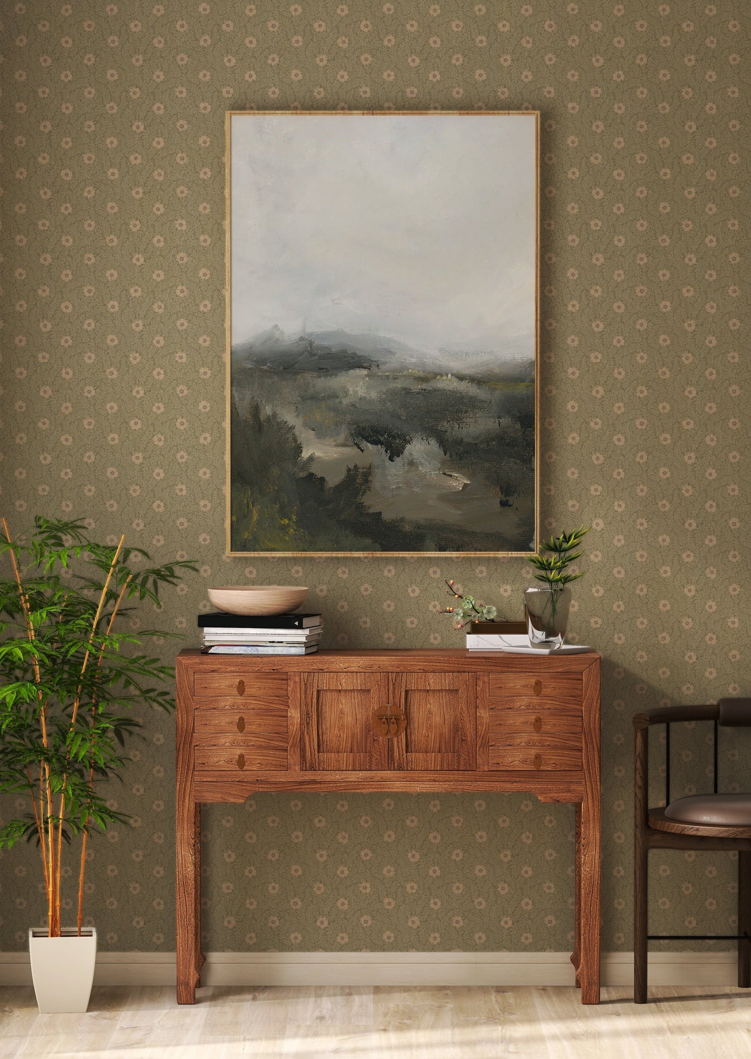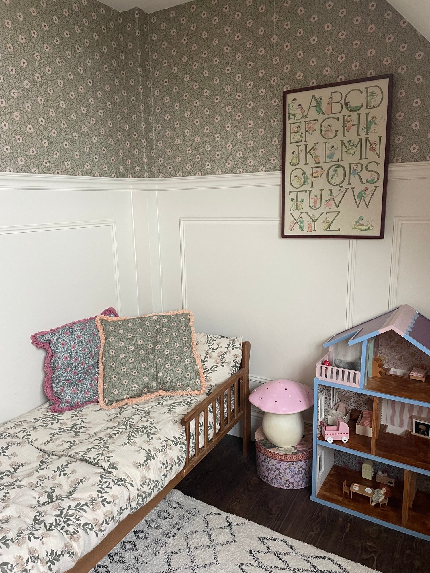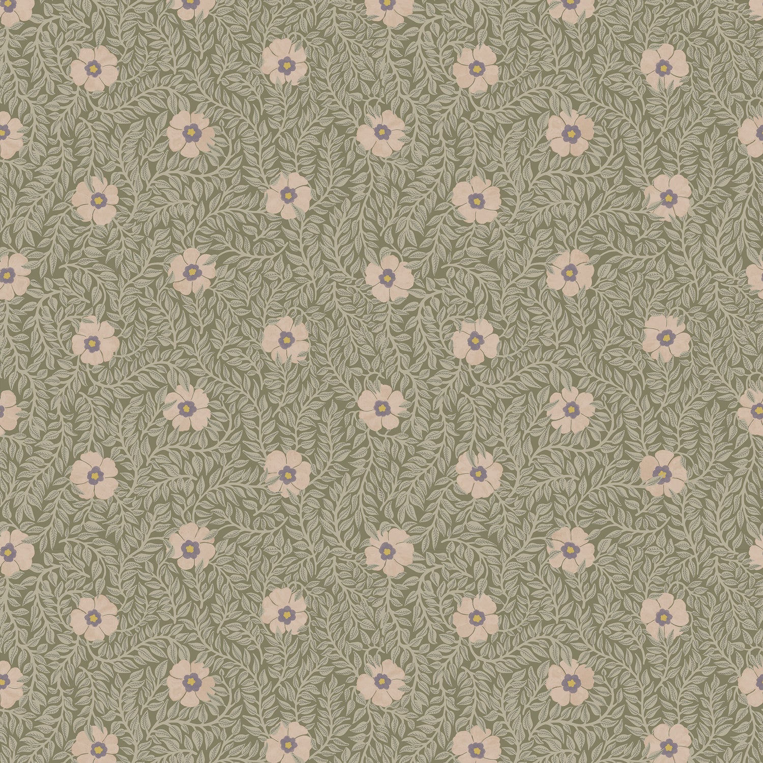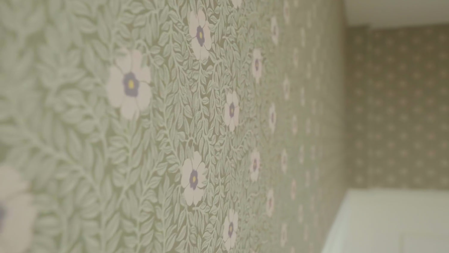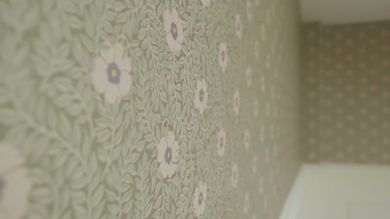 Le papier peint Kicki est disponible en plusieurs combinaisons de couleurs. Ici, vous voyez le papier peint en vert avec des fleurs lilas douces.