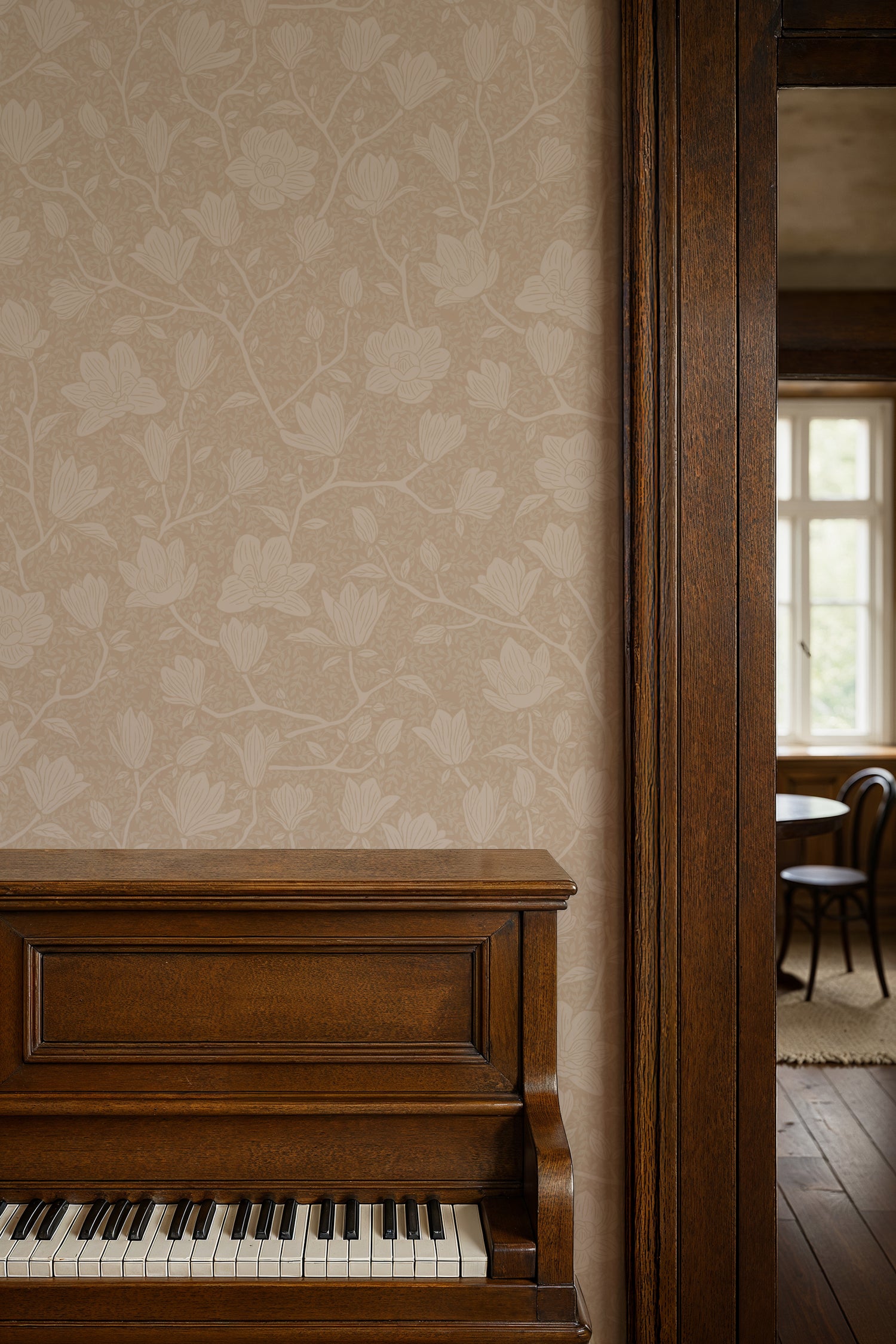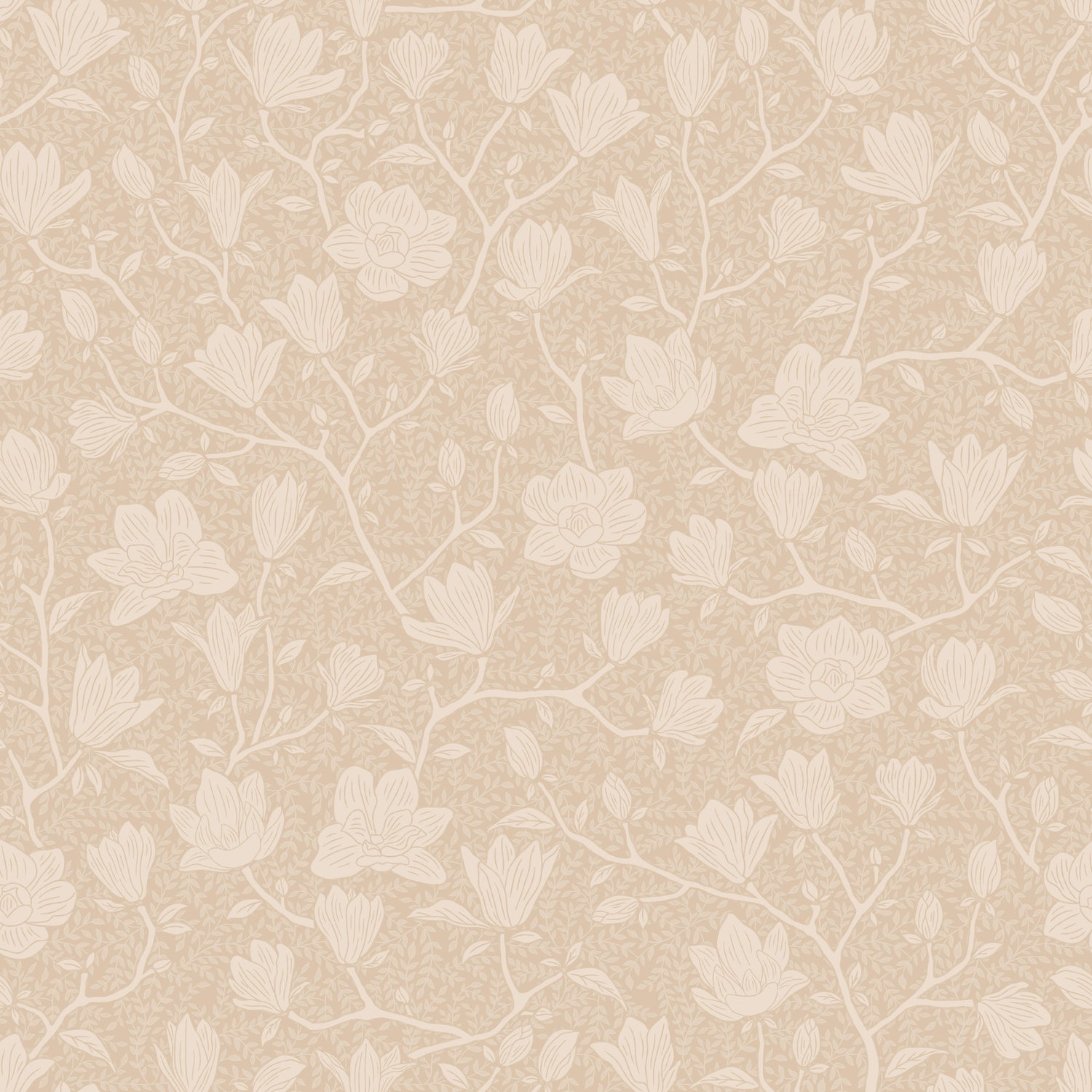 Noah est une douce célébration de la nature en pleine floraison. Des branches de magnolia dessinées à la main balayent un fond sable doux, créant un motif à la fois calme et discrètement confiant. Le travail de ligne détaillé apporte un charme botanique classique, tandis que la composition aérée le maintient frais et moderne.
