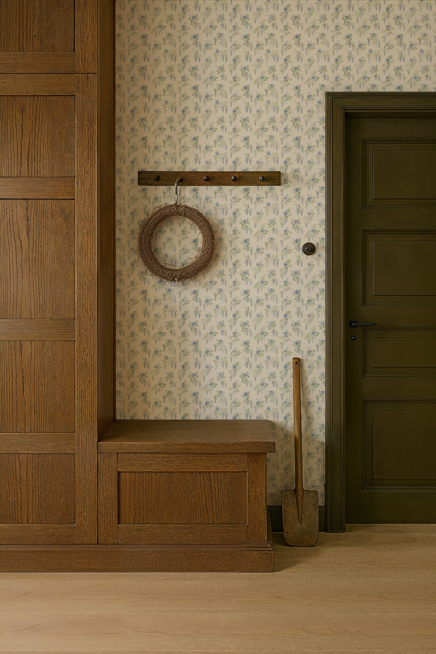 Inspiré par les châteaux français de mi-été, le Thirza présente des vignes de glycine dessinées à la main qui s'étendent doucement sur le mur, avec un rythme lâche et naturel.
